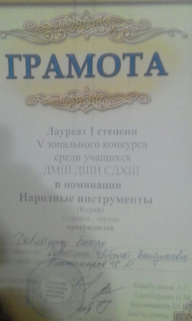 В г.Сибай 24 марта прошел V Зональный конкурс среди учащихся ДМШ,ДШИ,СДХШ Зауралья. В номинации народные инструменты курай выступали наши ученики старшая группа -Давлетшин Батыр, средняя группа Давлетшина Айлита, Рахматуллина Диана. В своей группе Давлетшин Батыр стал лауреатом I степени, Давлетшина Айлита номинацию "Надежда", а Рахматуллина Диана получила диплом участника среди 33 конкурсантов. Молодцы! Желаем им творческих успехов и новых побед!