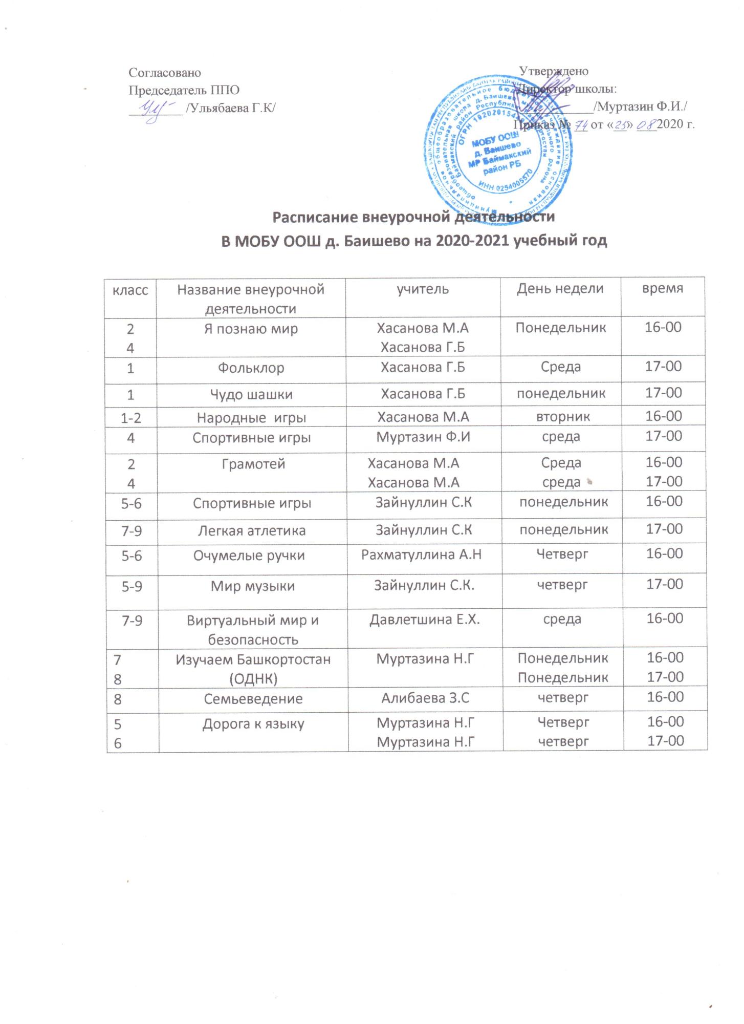 Расписание внеурочной деятельности на 2020-2021 год