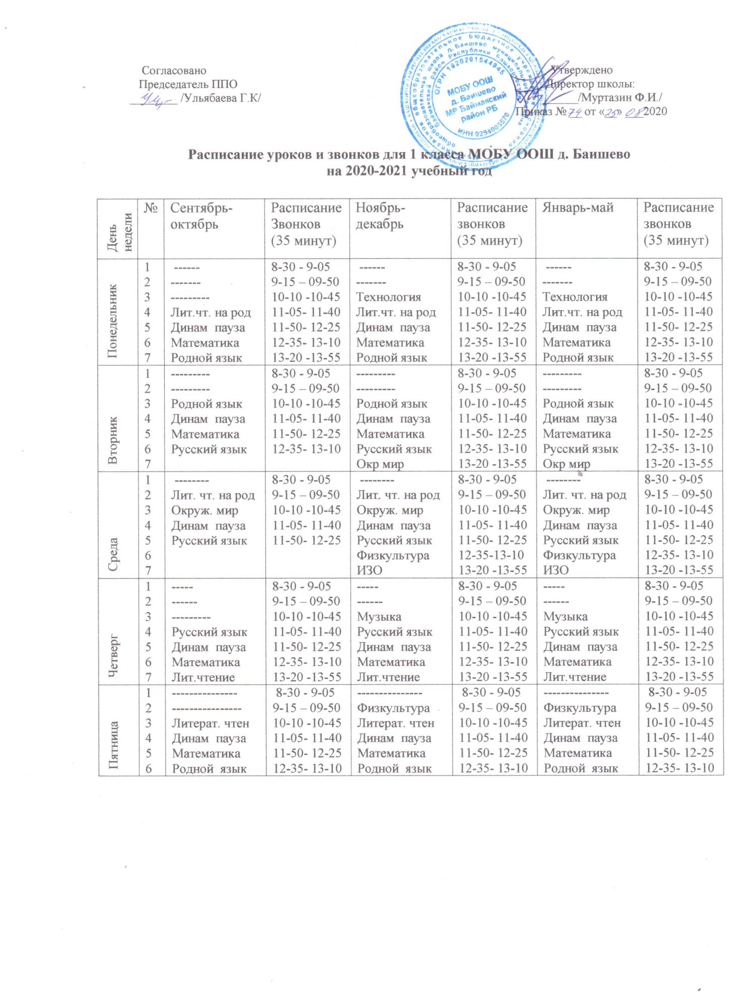 Расписание уроков и звонков для 1 класса на 2020-2021год
