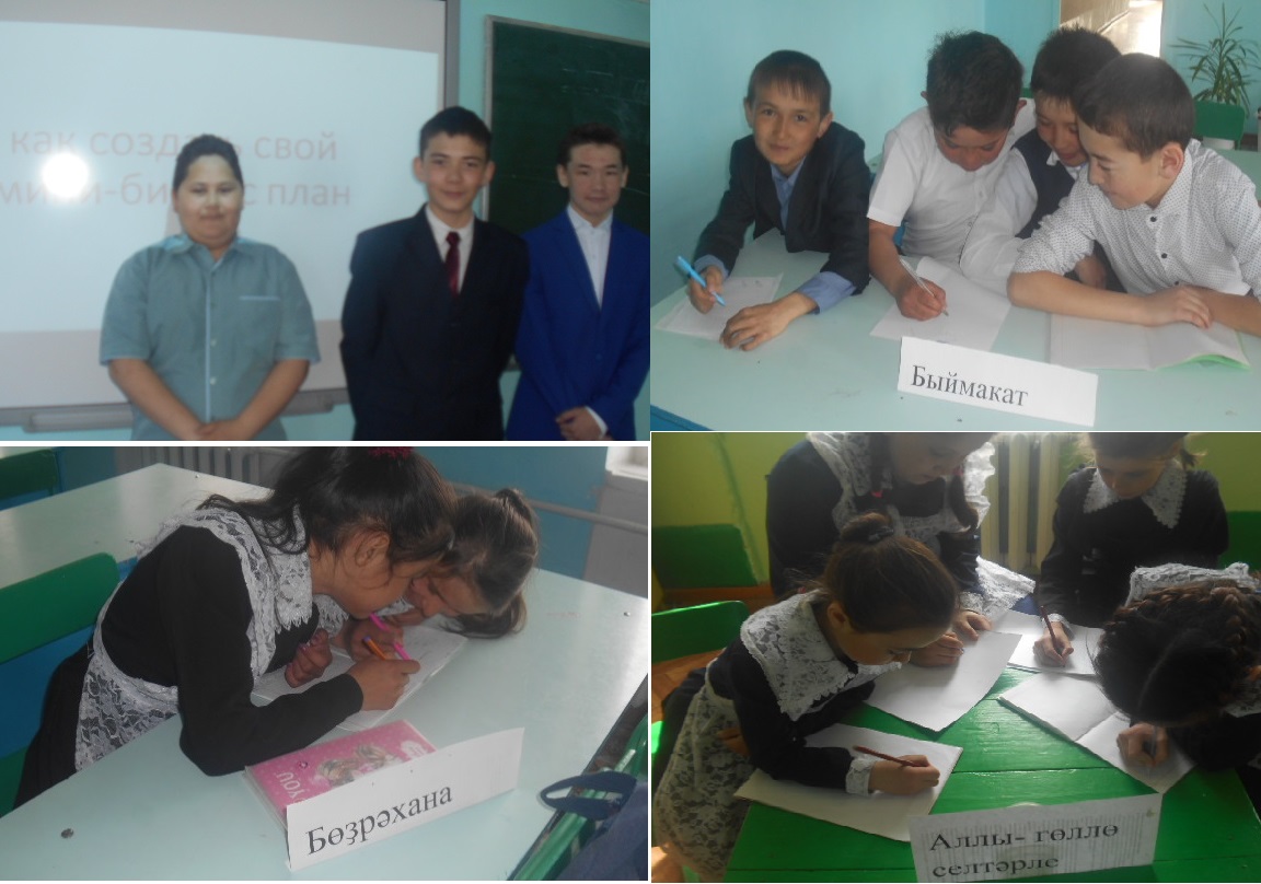Знакомство учащихся с правилами составления бизнес-плана. Игра в группах: учащиеся составляют мини проект бизнес-плана для будущего, чем бы они хотели заниматься в будущем. Например: открытие фитнес клуба, мини пекарни, пимокатного цеха, ремесленник, вязаные игрушки.
